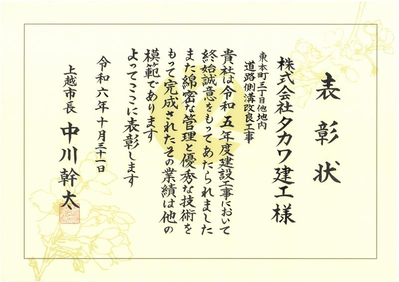 令和6年度上越市優良工事等表彰式が執り行われ、弊社が施工しました「道路側溝改良工事 東本町3丁目他地内」が、優良工事表彰を頂きました。